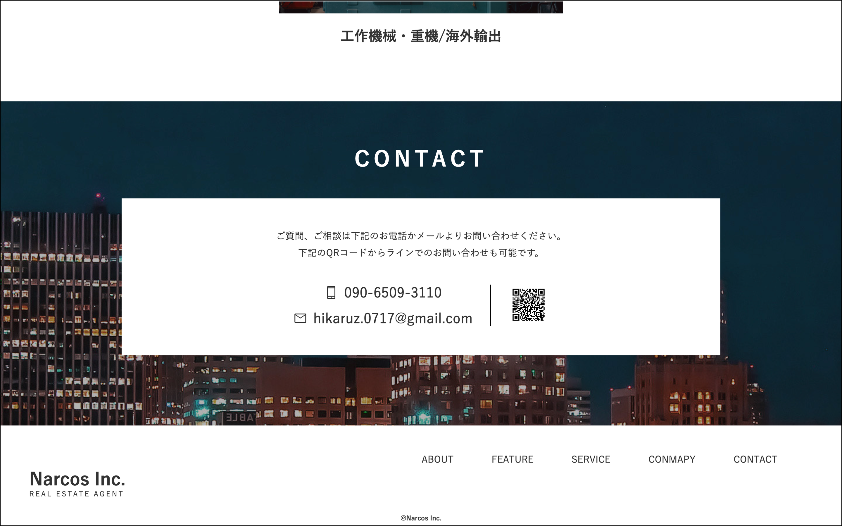 連絡先が一目でわかるよう、携帯電話とメールのアイコンを連絡先の前に配置。ラインからの問い合わせのがスムーズにできるよう、アカウント追加用のQRコードを配置しています。