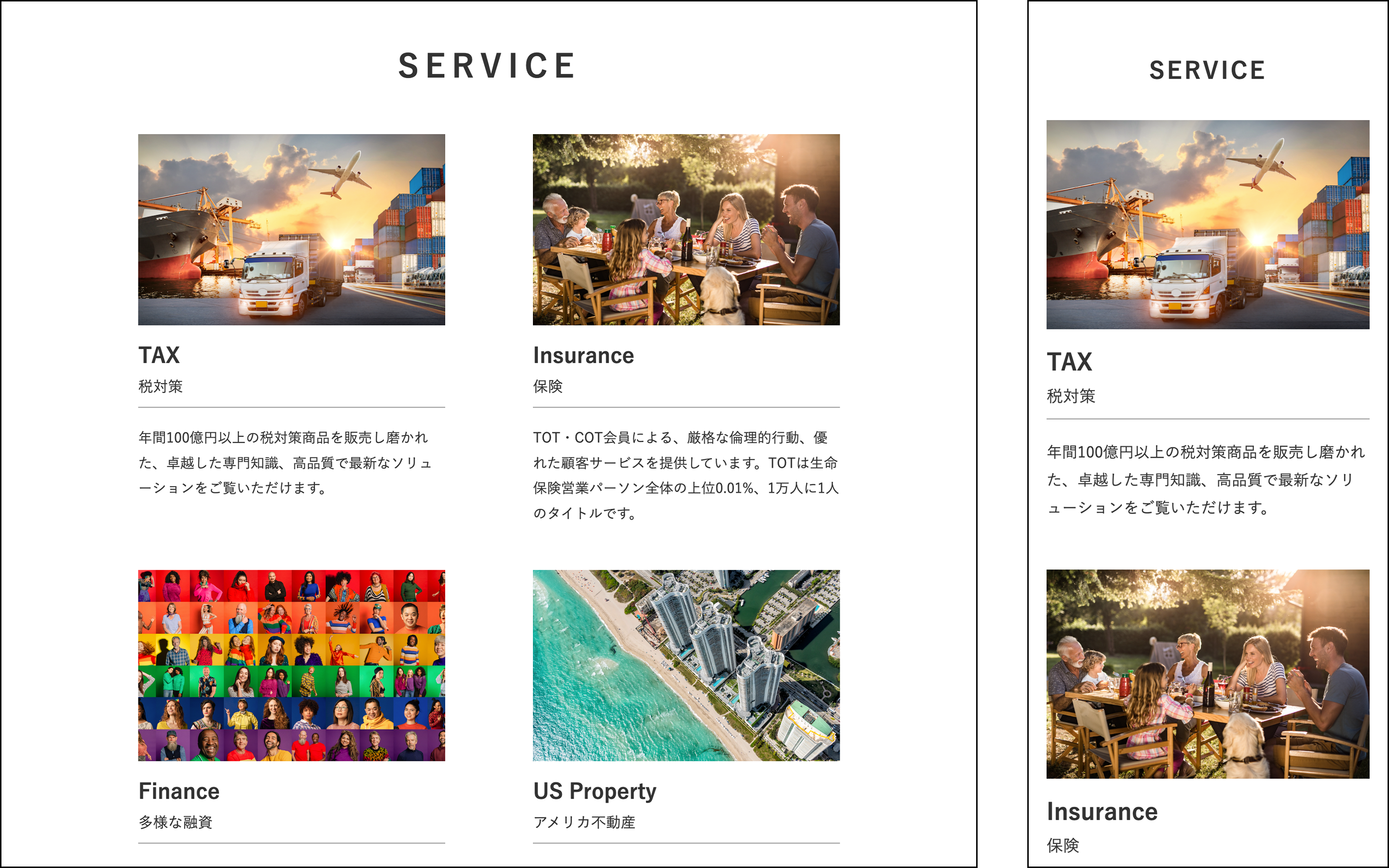 1週間と限られた納期でのサイト制作でしたので、デザインをシンプルなものにし、レイアウトを中央揃えにすることで、レスポンシブ対応を簡単にし、コーディングにかかる時間を短縮しました。