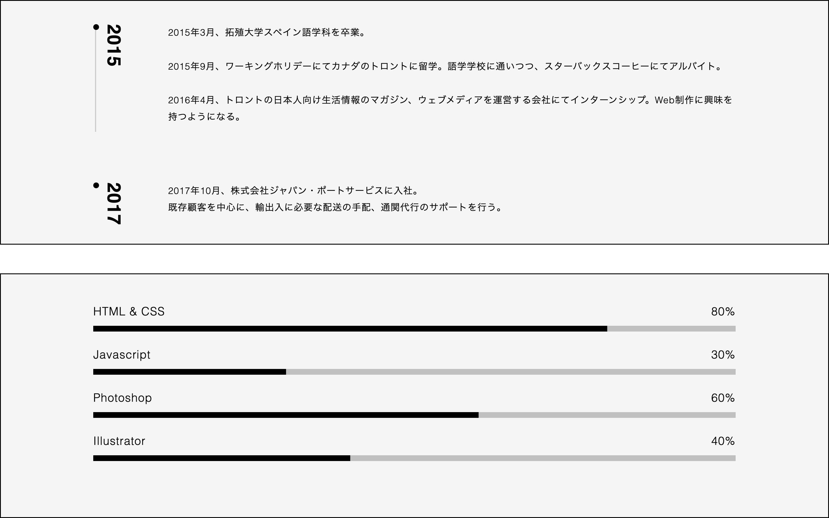 自己紹介ページでは、ユーザーに飽きずに下まで読んでもらえるよう、スクロールをすると線が伸び縮みする動きと、表示エリアに入ると、スキルバーが横から伸びてくる動きをつけました。